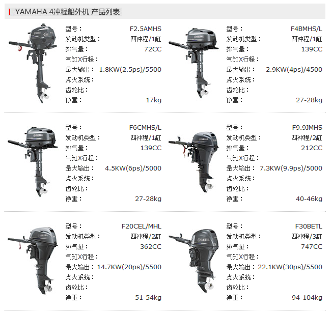四沖程船外機系列,具有***的燃料經濟性和清潔排放特性。對于30PS和更高指標的船外機,配有高性能電子燃油噴射,可使性能達到更高水平。在很多型號中由于雅馬哈的先進技術,還實現了更高的性能,更輕的質量和緊湊式的設計,可與兩沖程媲美。